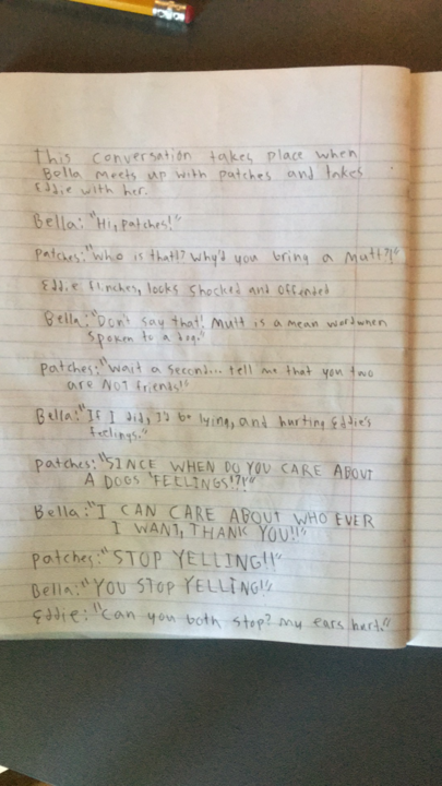 Focus on a scene where there is a dialog taking place. Write out what's being said by each character and make thumbnail drawings of what they're doing during that dialog.